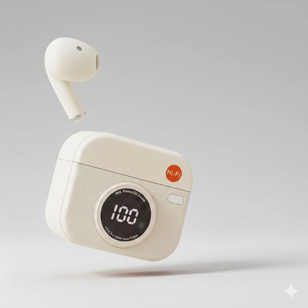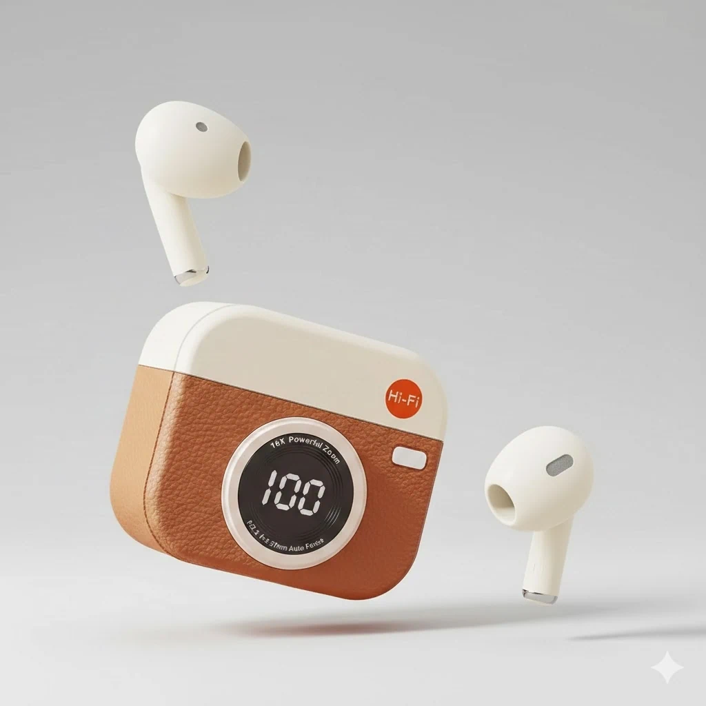 קייס טעינה בעיצוב ייחודי: קייס בצורת מצלמה שמגן על האוזניות ומוסיף סטייל.