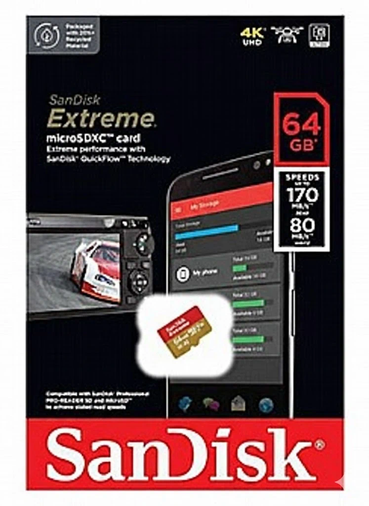 כרטיס זיכרון SanDisk Extreme בנפח 64GB, מהיר במיוחד לצילום וידאו ותמונות באיכות גבוהה, מתאים לסמארטפונים, טאבלטים ומצלמות.