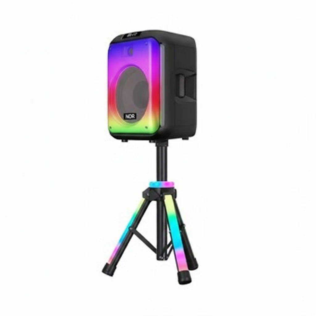 רמקול קריוקי איכותי NDR-102B בעיצוב מודרני וייחודי, עם תאורת LED צבעונית, מיקרופון אלחוטי כלול, חיבורים מגוונים וסטנד מואר RGB – הבחירה המושלמת לאירועים, מסיבות והגברה ניידת.